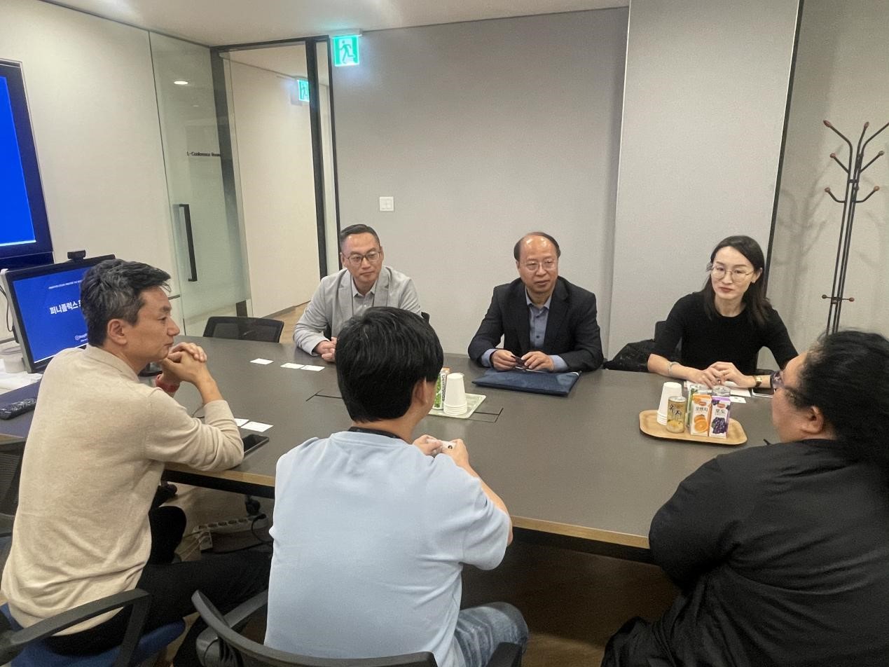 在韩期间,代表团还参观了韩国世宗大学动漫产业公司合作公司之一FunnyFlux动画公司,该公司出品了《萌鸡小队》、《超级飞侠》、《量子战队之恐龙守护》等知名动画片,通过与副社长李英虎、创作管理部部长金英浩的交流,了解了韩国产学合作的运行模式以及项目开展情况,为我方产学研基地的建设提供了思路。