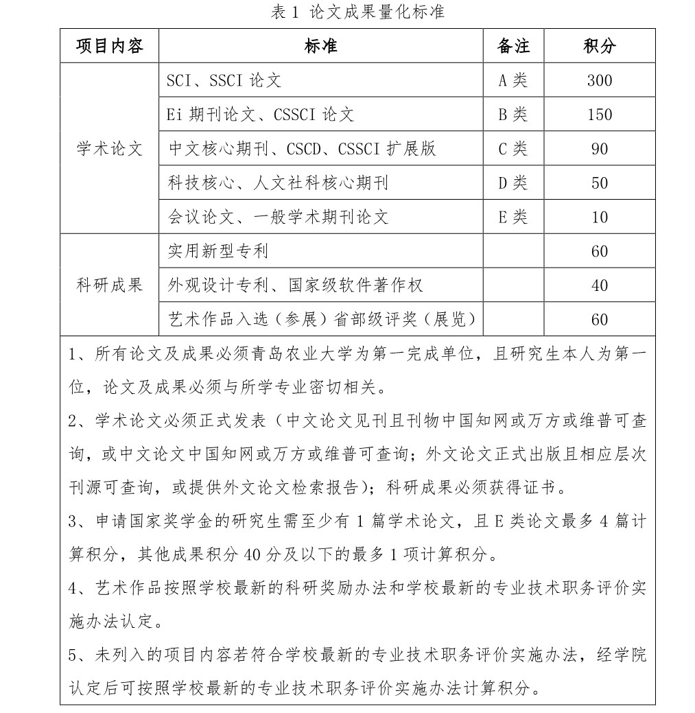 3、科研成绩:本年度内获得的科研成果,科研成果参见“表 1 论文成果量化标准”计算总积分,总积分最高者认定科研成绩为 100 分,其他同学的总积分相比总积分最高者计算科研成绩。