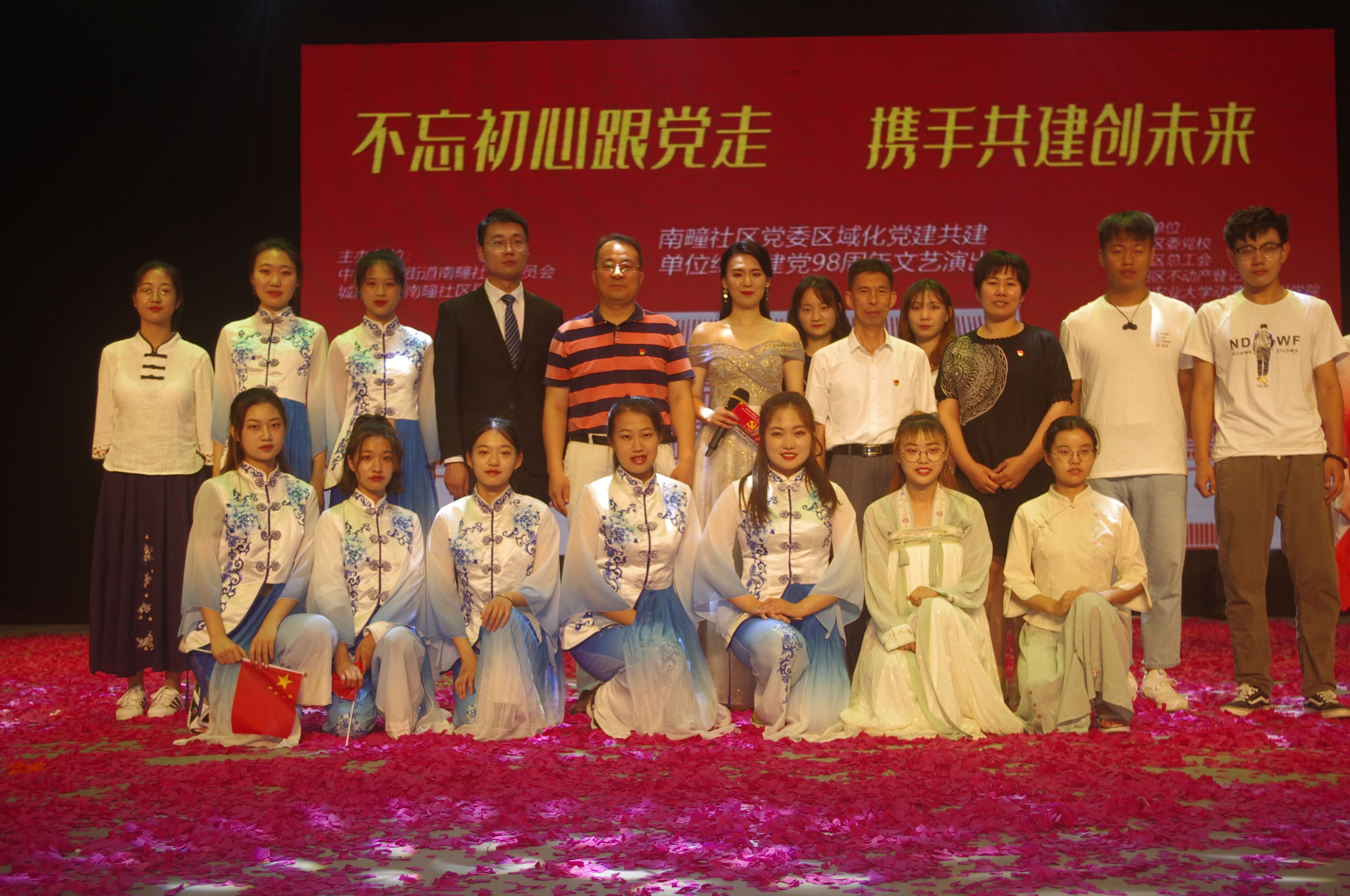 为纪念中国共产党成立98周年,回顾党的光辉历程,激励广大党员牢记初心使命,忠诚干净担当,为实现中华民族伟大复兴的中国梦不懈奋斗。6月28日,动漫与传媒公司党委联合城阳南疃社区党委、城阳区委党校、城阳区总工会、城阳区不动产登记中心、园艺公司、城阳派出所、城阳区第二实验中学、青岛景园假日酒店有限公司、城阳街道长城路居委会、城阳街道长城路小学、青岛斯瑞杰商业运营有限公司等八个共建单位党组织在城阳区第二实验中学报告厅组织举办“不忘初心跟党走,携手共建创未来”纪念建党98周年文艺演出,共有党员代表等400余人参加本次活动。动漫与传媒公司党委副书记王乾、支部书记王宏儒及部分师生代表参加,公司辅导员李之泓作为晚会主持人参加。