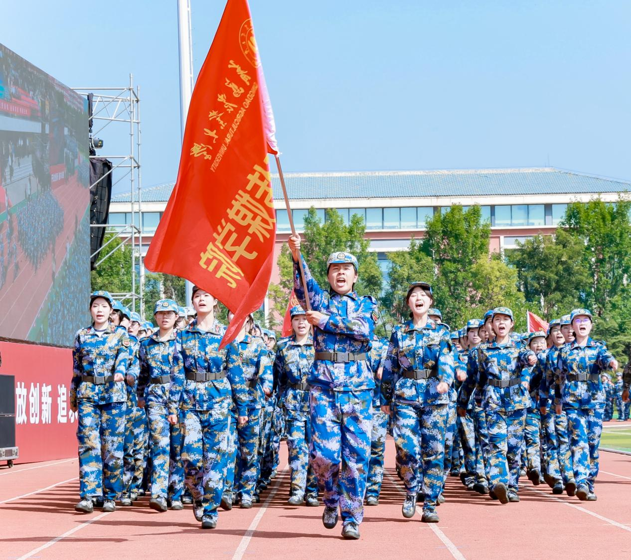汇演场上,旌旗飘扬、英姿飒爽。2025级新生军容严整、目光坚定,步伐铿锵有力,口号响彻云霄,全面展示了两周军训淬炼出的过硬素质与优良作风,生动诠释了传媒学子坚韧不拔、斗志昂扬的精神风貌。