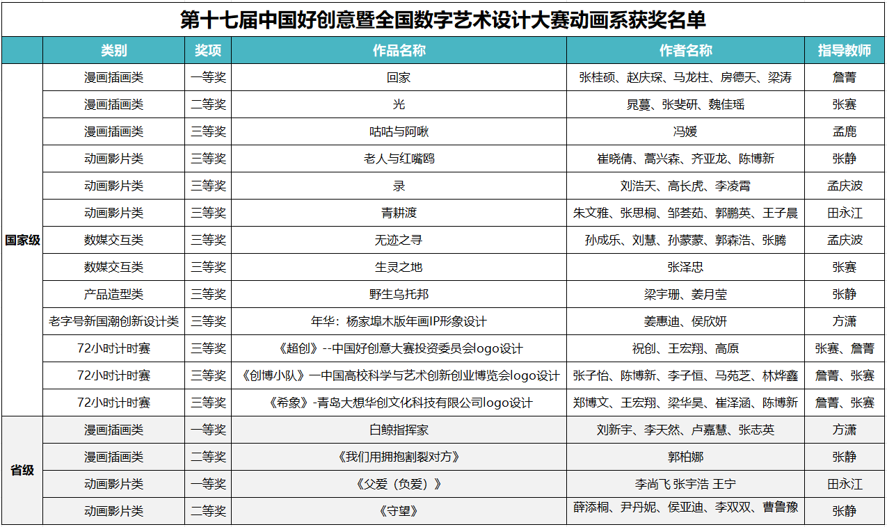近日,由中国电子视像行业协会、教育部中国高等教育学会联合主办的第十七届中国好创意暨全国数字艺术设计大赛国赛评审落下帷幕。公司betway西汉姆联动画系积极组织师生参赛,共投稿作品44份,最终获得国家级一等奖1项,二等奖1项、三等奖11项,省级一等奖2项、二等奖2项,获优秀指导教师2人。为推动学科竞赛在数字艺术公司产品、创新设计人才培养等方面发挥了重要作用。